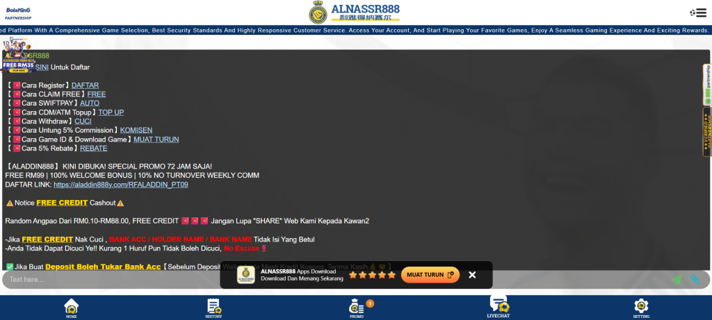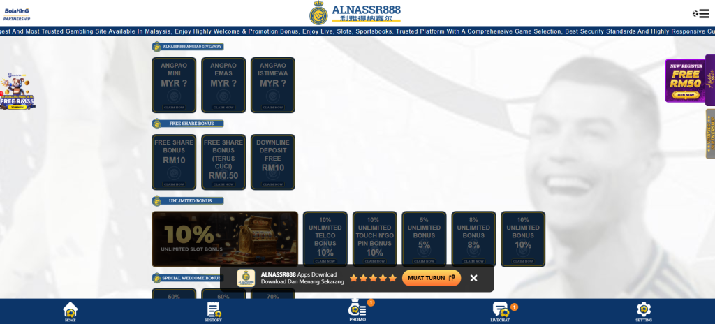 In the rapidly growing online casino industry across Southeast Asia, ALNASSR888 has carved out a reputation as a trusted and entertaining gaming platform. Backed by the BolaKing partnership, the brand emphasizes reliability, security, and attractive promotions designed for both new and returning players. With a wide selection of slots, live casino games, fishing titles, and sports betting options, ALNASSR888 provides a well-rounded experience for Malaysians looking for quality online gaming.