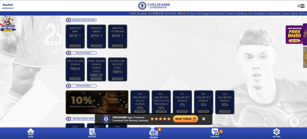 Chelsea888 has quickly established itself as a recognizable name in Malaysia’s online casino industry, combining a sleek sports-inspired design with a wide collection of games and exciting bonuses. Built under the Bolaking Partnership, the platform emphasizes trust, secure gameplay, and fast rewards. For players seeking an online casino that delivers a blend of slots, live casino, fishing, sports, e-sports, and lottery games, Chelsea888 aims to be an all-in-one solution.