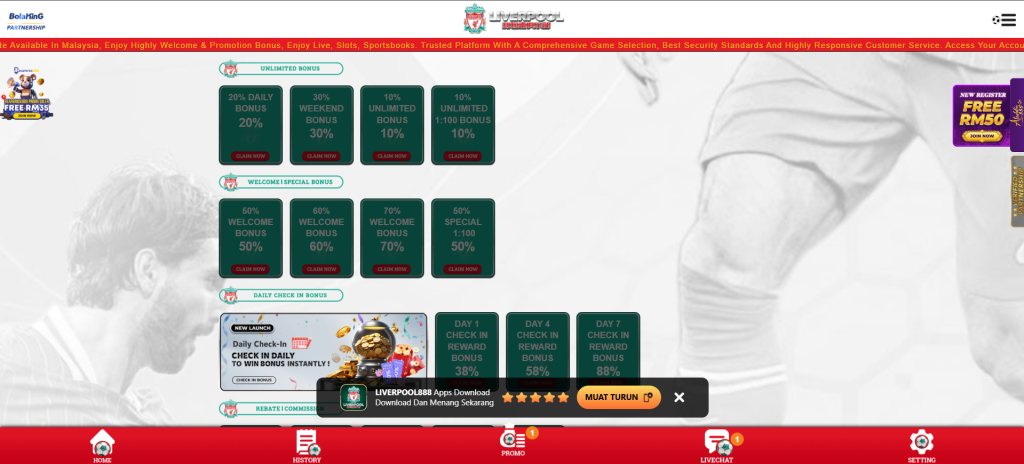 Liverpool888’s promotional lineup is one of the main reasons it stands out. Based on the official website, here are the current offers: