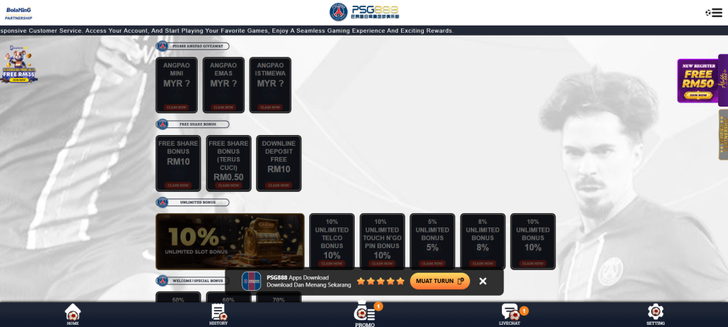 In Malaysia’s competitive online casino market, PSG888 has gained strong recognition as part of the Bolaking Partnership. Backed by the reputation of an official verified partner, PSG888 focuses on delivering reliability, fair play, and a rich mix of games and promotions. With exclusive rebates, free credits, and consistent bonuses, the platform has become a popular choice among slot, live casino, and sports betting players.