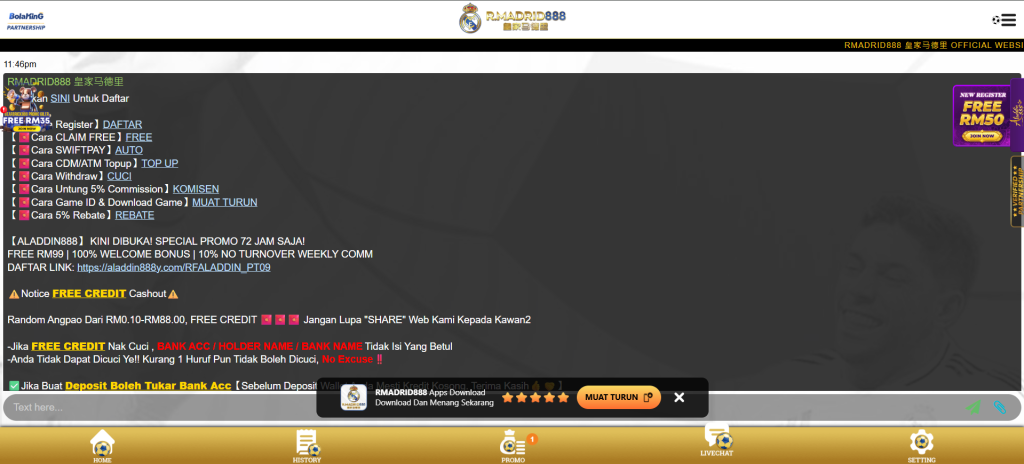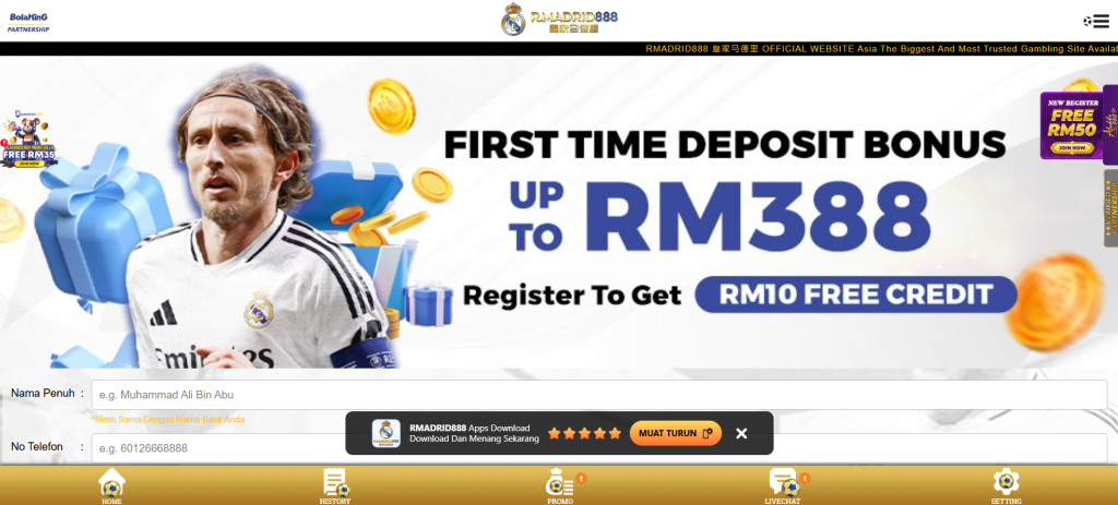 Rmadrid888 is an online casino designed for Malaysian players, offering a mix of slots, live casino, fishing games, sports betting, and 4D lottery. Its partnership with Bolaking ensures credibility, while its branding aligns with a football-inspired theme that resonates strongly with sports fans. The platform emphasizes fairness, accessibility, and promotions tailored for both new and loyal members.